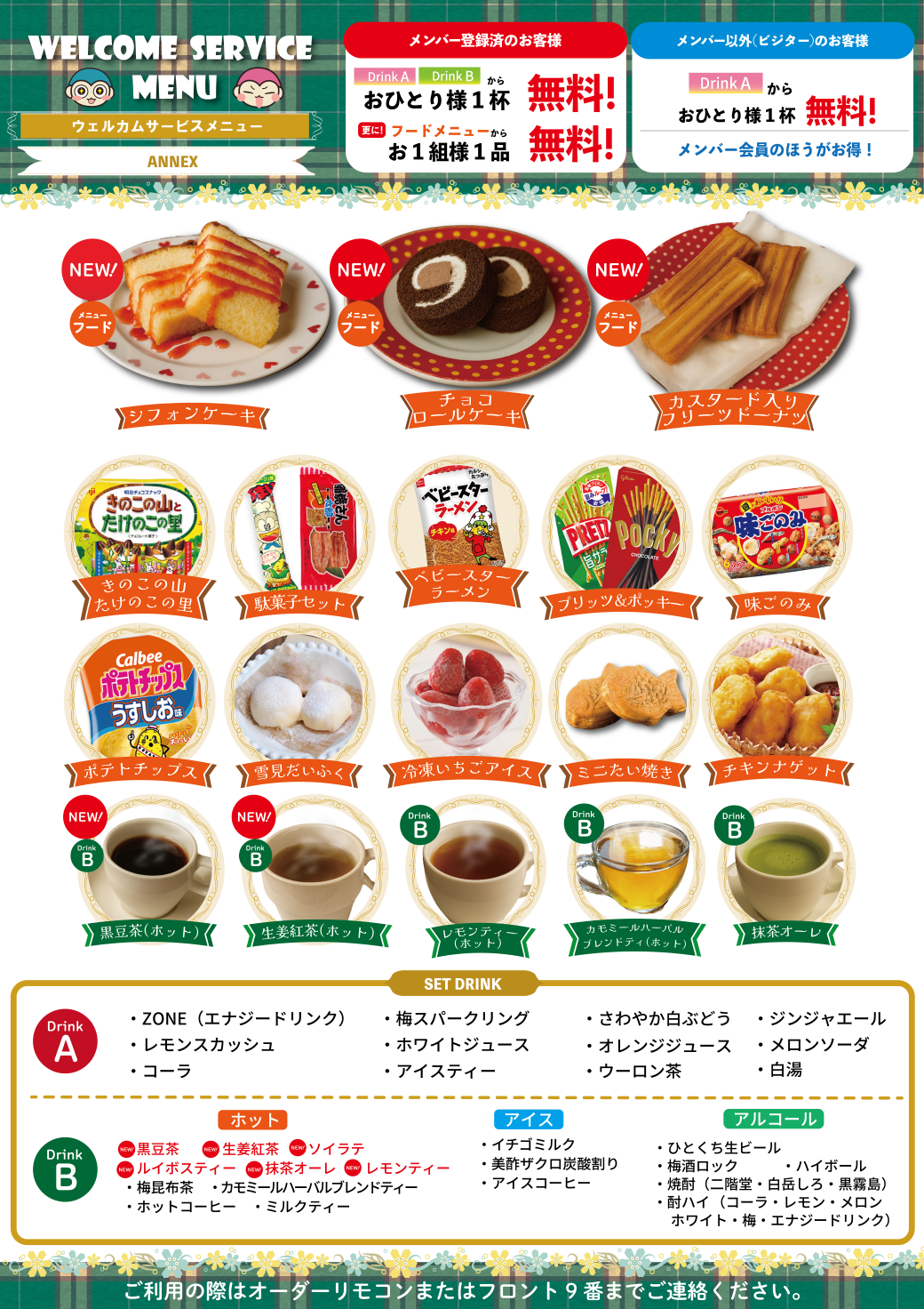- 内容や商品番号は店舗によって異なる場合がございます。オーダーの際は、お部屋に設置されたカタログ・POP等でご確認の上、ご注文ください。